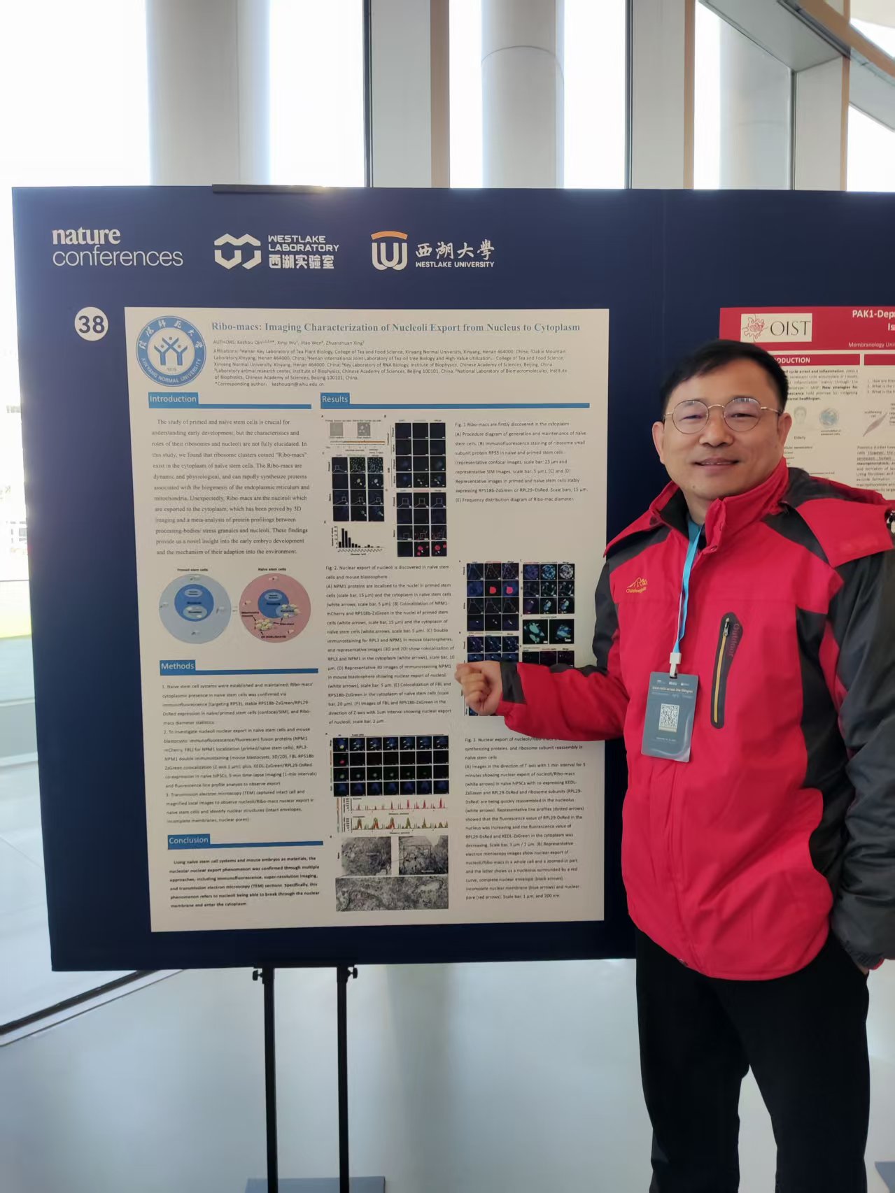 秦克周老师基于自身近期研究成果撰写的学术墙报,经大会组委会严格筛选后成功入选,并在会议现场进行展示。墙报内容聚焦于两种干细胞模型的成像特征,即Primed干细胞向Naïve干细胞转化过程中的“核仁出核”现象的首次发现。该研究工作采用多种成像手段,既体现了扎实的研究基础,也展现了创新的学术思路,吸引了众多参会学者驻足观看、交流探讨。在互动过程中,多位业内知名专家对该研究给予关注,其中一位专家在深入了解研究细节后评价道:“此项工作非常有意思”,高度认可研究的创新性与探索价值。我集团秦老师不仅详细介绍了研究背景、方法与成果,同时认真听取同行及专家的意见建议,为后续研究工作的深化与拓展积累了宝贵经验。