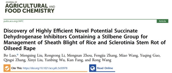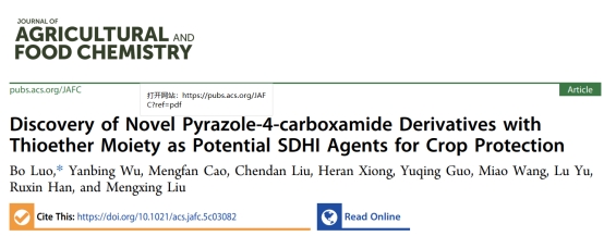 近日,我集团罗波博士团队在国际知名的农林科学领域学术期刊《Journal of Agricultural and Food Chemistry》上发表了两篇学术论文。题目分别为《Discovery of novel pyrazole-4-carboxamide derivatives with thioether moiety as potential SDHI agents for crop protection》(DOI: 10.1021/acs.jafc.5c03082)和《Discovery of highly efficient novel potential SDHIs containing stilbenes group for management of sheath blight of rice and sclerotinia stem rot of oilseed rape》(DOI: 10.1021/acs.jafc.5c03978)。