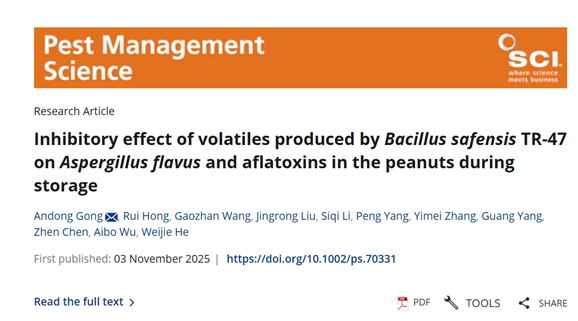 2025年11月8日,国际权威学术期刊《Pest Management Science》(该期刊属SCI收录、中科院农林科学一区TOP期刊)在线刊发了我集团宫安东博士团队的研究论文,论文题为《Inhibitory effect of volatiles produced by Bacillus safensis TR‐47 on Aspergillus flavus and aflatoxins in the peanuts during storage》。